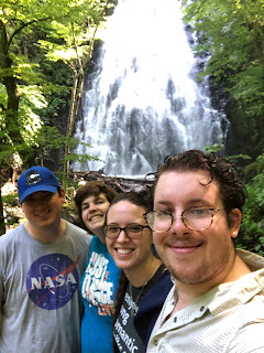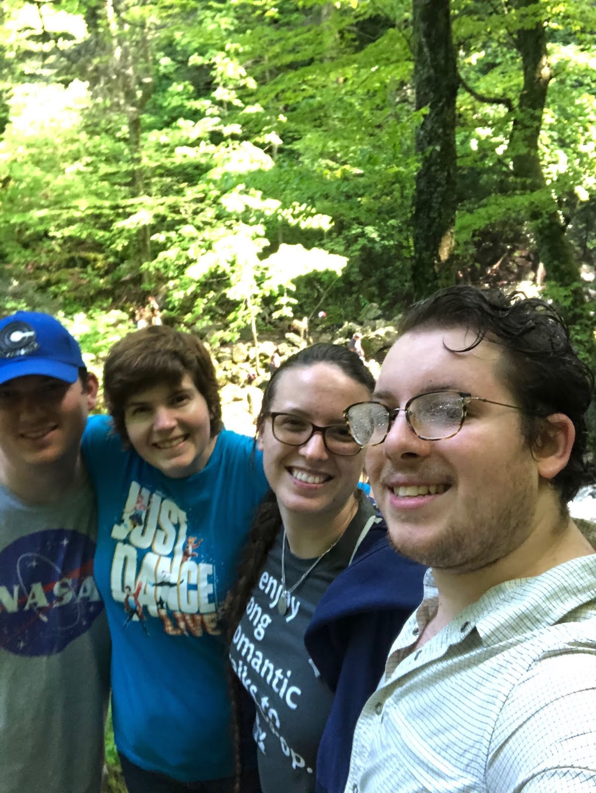 Today we hiked Crabtree Falls after getting a wee bit lost in the mountains (as one does). The GPS wasn’t exactly sure how to get there, and Google didn’t believe there was a Crabtree Falls visitor center even though later on it became apparent. We also got to drive by some mining sites, campsites, rock shops and all of the above were closed but we did get to enjoy a few scenic lookouts. At long last, we arrived at our destination, and began our hike to the falls! We started on the decidedly less tiresome way (it’s a loop) although there were several muddy creeks to cross and slick steps to descend before we reached the glorious falls. I’ve not seen many waterfalls in my life, so this seemed a very new feeling for me. It was awe-inspiring, and super cool! We were able to go so close to it and even sit in the biggest sprays of water. In the first pic, that is Doron, Muriel and I. We climbed and waded bare foot (coooooldddd water!) to the middle of the falls. The water spray was intense there. In the second set of pics with all 4 of us, Doron is so wet because he did extra climbing on the far side where more splash was happening. There is also a video of the fall at the bottom!