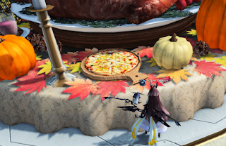 This is from their pre-Thanksgiving event that will extend past Thanksgiving as well. I found it amusing so I wanted to share it with you all. The area in the game is in the main hub where the center-piece can be found. Apparently NA players are known for eating whole cheesy pizzas with their traditional Thanksgiving meal.