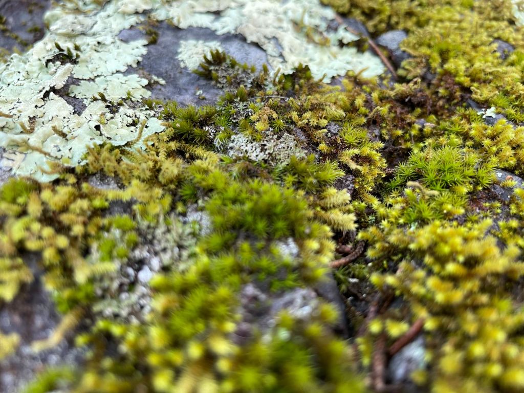 The river (img. 1) was very full after days of constant rain. The velocity at which the water cascading over algae-slicked rocks and through muddy crevices was far too alarming when viewed up close, so we kept our distance. Our first distinctive formation, (img. 2) we coined as “Jabba the Rock,” (img. 3) and giggled at our cleverness. Further down the path, I spied a wonderful lichen and moss growth. Velvety soft to the touch, the first fresh moss of early Spring breathed green life into a world of brown.