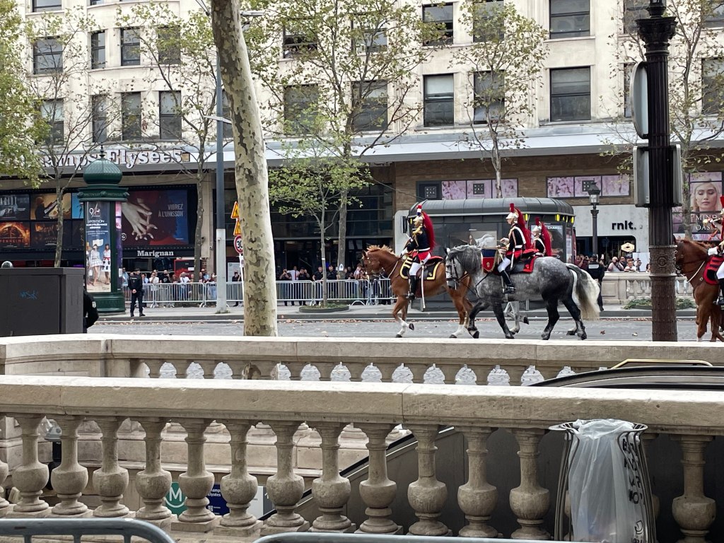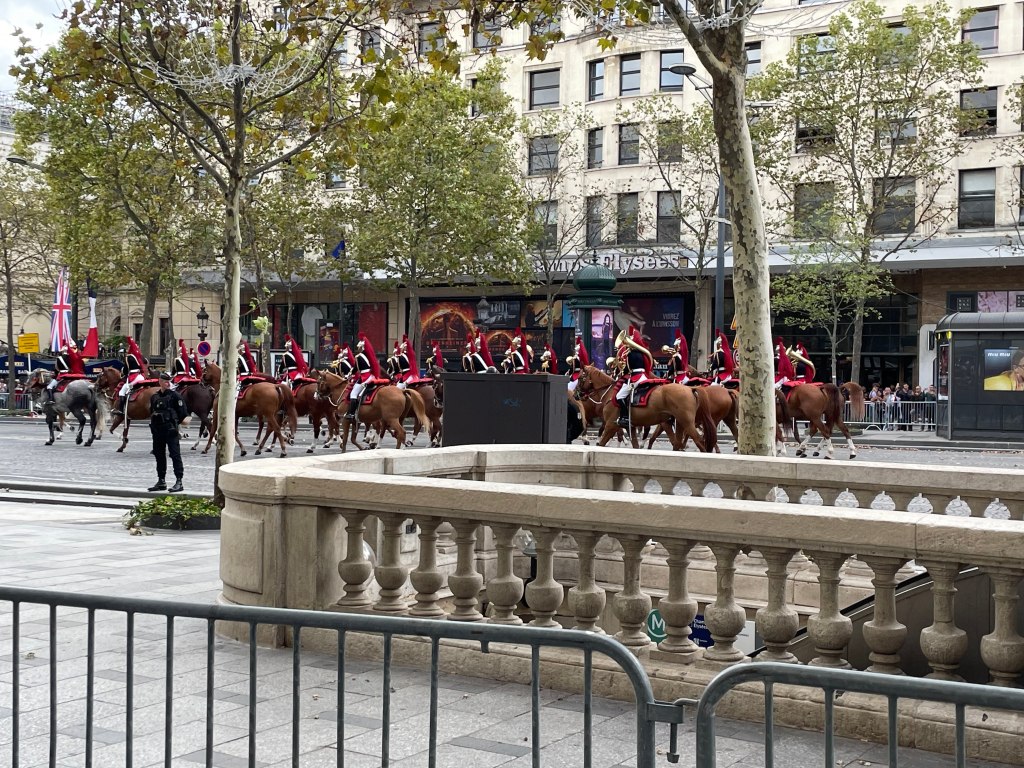 Our first AirBnB stay is located on the Avenue des Champs-Élysées which is filled to the brim with theatres, cafés, and luxury shops, as well is the finish of the Tour de France cycling race, and is the avenue used for the annual Bastille Day military parade! The name is French for the Elysian Fields, the place for dead heroes in Greek mythology. It has been described as the “most beautiful avenue in the whole world”.[1] We were surprised by an event that we did not know was happening this day, that being King Charles was visiting! (Though I’m sure many of us would have preferred Queen Elizabeth II if she were still alive.) He arrived in France today for a three-day state visit to work with President Emmanuel Macron in hopes of smoothing over their rocky relations in the past. The anti-Charles sentiment is quite prevalent in Paris. We walked into a little convenience shop to ask about nearby ATMs and he was telling us about the procession and was like, “would you like something to throw at him? A banana? A banana?” The procession was quite impressive, as expected of a monarch, but I was mostly interested in the battalion of men on horseback.