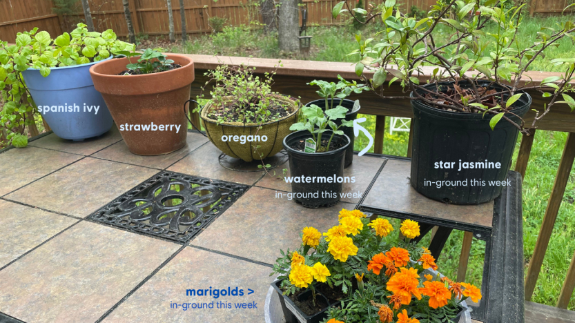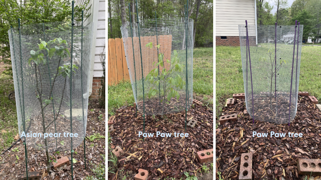 To sing a different tune from last year, and while the depression lingers within, I am ever excited for spring so that I can be planting, weeding, and watching my beloved garden grow and expand. A short post today to show garden work so far since late March, both potted and in-ground – with labels! The pear and paw paw trees have those rad new anti-deer cages that I handmade using chicken wire, zipties, and multiple blood sacrifices. 🥲 (Note, there is more to my garden, but these were the best looking plants right now!) I will share another progress picture later in April when more plants are in-ground and blooming! Then another progress picture in June!